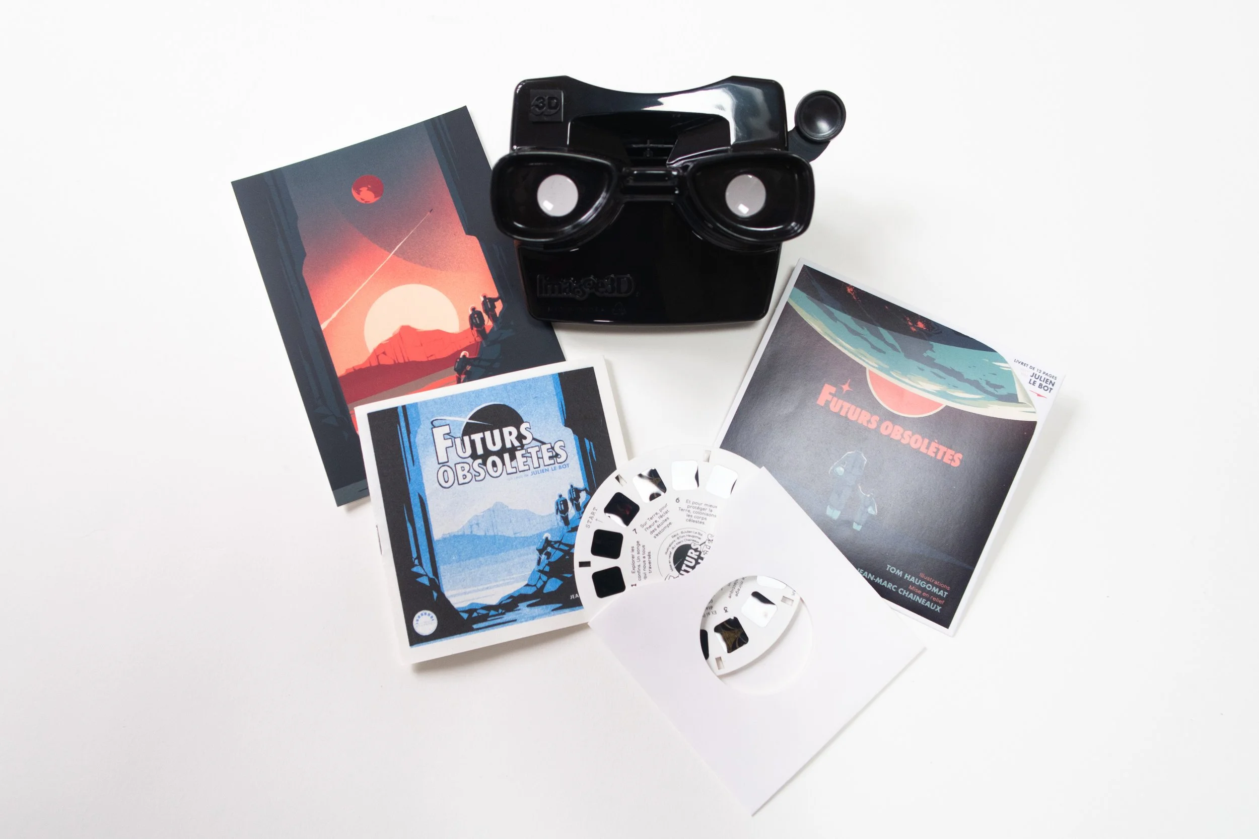 Tom Haugomat, Julien Le Bot, and Jean-Marc Chaineaux join forces to offer a unique experience that extends the reading of the narrative Futurs Obsolètes (Actes Sud, 2024). Dive into the images of the book with a limited-edition reel (disc) in the View-Master format, featuring seven illustrations by Tom Haugomat enhanced with depth and captions. The project has been designed in the finest tradition of the legendary View-Master packets. Ready your stereoscopes and start viewing!